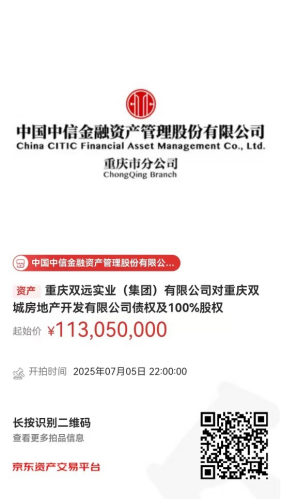 重慶雙遠(yuǎn)實(shí)業(yè)(集團(tuán))有限公司持有重慶雙城房地產(chǎn)開發(fā)有限公司債權(quán)和100%股權(quán)。重慶雙遠(yuǎn)實(shí)業(yè)(集團(tuán))有限公司將于2025年7月5日22時(shí)至2025年7月6日22時(shí)在京東拍賣網(wǎng)通過公開競(jìng)價(jià)方式進(jìn)行處置,拍賣鏈接如下圖所示,現(xiàn)予以公告。