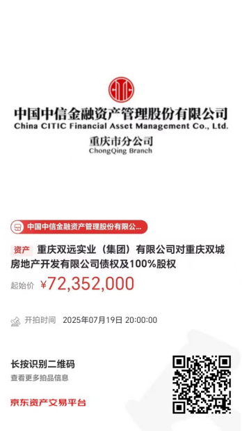 重慶雙遠(yuǎn)實(shí)業(yè)(集團(tuán))有限公司持有重慶雙城房地產(chǎn)開發(fā)有限公司債權(quán)和100%股權(quán)。重慶雙遠(yuǎn)實(shí)業(yè)(集團(tuán))有限公司將于2025年7月19日20時至2025年7月20日20時在京東拍賣網(wǎng)通過公開競價方式進(jìn)行處置,拍賣鏈接如下圖所示,現(xiàn)予以公告。