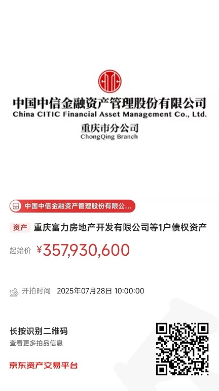 中國(guó)中信金融資產(chǎn)管理股份有限公司重慶市分公司(以下簡(jiǎn)稱(chēng)“中信金融資產(chǎn)重慶分公司”)持有的對(duì)重慶富力房地產(chǎn)開(kāi)發(fā)有限公司等1戶(hù)債權(quán)資產(chǎn)定于2025年7月28日10時(shí)至2025年7月29日10時(shí)止(延時(shí)的除外)在京東資產(chǎn)交易平臺(tái)(網(wǎng)址https://zcpm.jd.com/)進(jìn)行公開(kāi)競(jìng)價(jià)活動(dòng),拍賣(mài)鏈接如下圖所示,競(jìng)拍相關(guān)事宜詳見(jiàn)拍賣(mài)鏈接里的競(jìng)拍公告及競(jìng)拍須知,現(xiàn)予以公告。