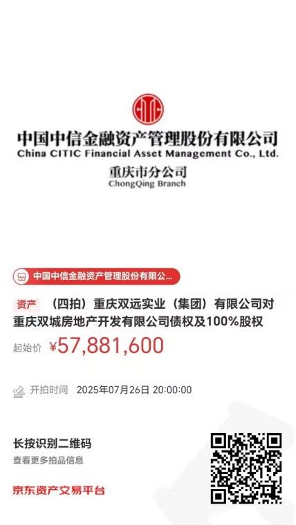 重慶雙遠(yuǎn)實(shí)業(yè)(集團(tuán))有限公司持有重慶雙城房地產(chǎn)開(kāi)發(fā)有限公司債權(quán)和100%股權(quán)。重慶雙遠(yuǎn)實(shí)業(yè)(集團(tuán))有限公司將于2025年7月26日20時(shí)至2025年7月27日20時(shí)在京東拍賣(mài)網(wǎng)通過(guò)公開(kāi)競(jìng)價(jià)方式進(jìn)行處置,拍賣(mài)鏈接如下圖所示,現(xiàn)予以公告。