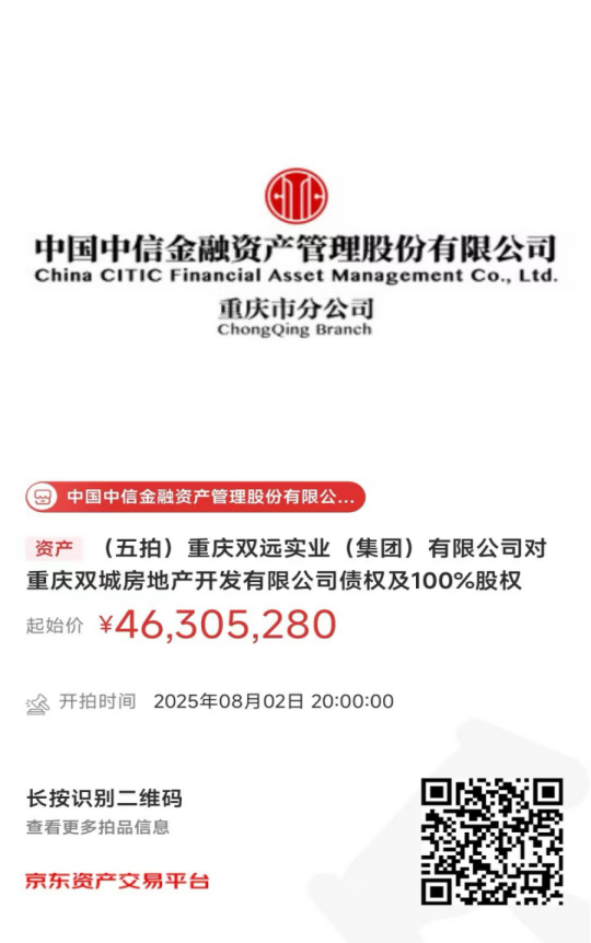 重慶雙遠實業(yè)(集團)有限公司持有重慶雙城房地產開發(fā)有限公司債權和100%股權。重慶雙遠實業(yè)(集團)有限公司將于2025年8月2日20時至2025年8月3日20時在京東拍賣網(wǎng)通過公開競價方式進行處置,拍賣鏈接如下圖所示,現(xiàn)予以公告。